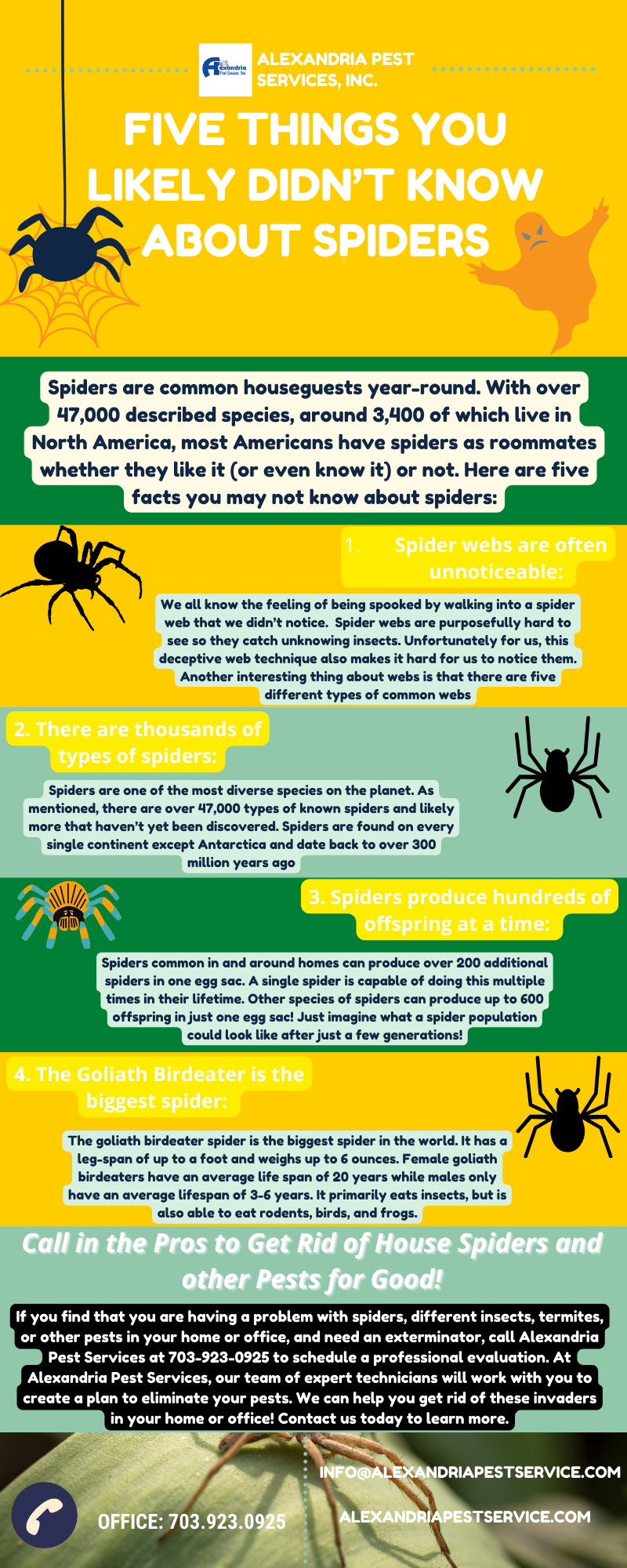 Spiders are common houseguests year-round. With over 47,000 described species, around 3,400 of which live in North America, most Americans have spiders as roommates whether they like it(or even know it) or not. To know more visit our site : http://alexandriapestservice.com/